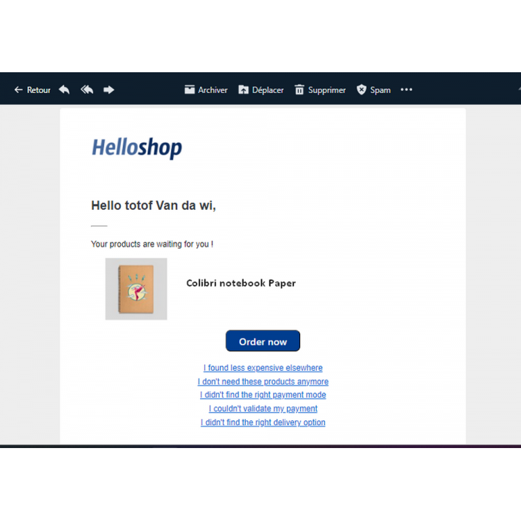 - In de e-mail die naar klanten wordt gestuurd, kunnen ze via extra links uitleggen waarom ze het aankoopproces hebben afgebroken, zodat u uw aanbod en uw bestelproces kunt corrigeren